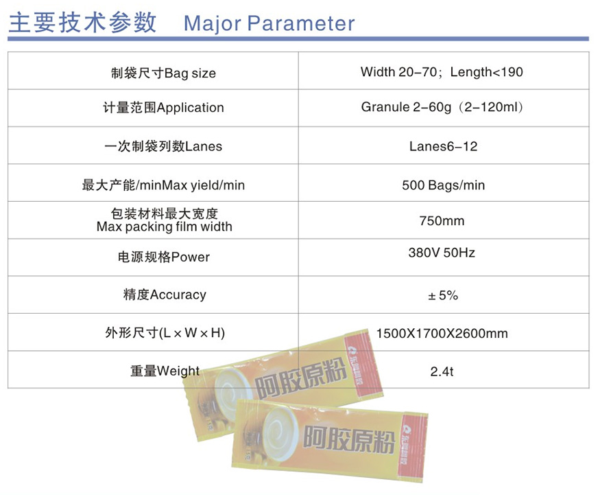 This machine can be widely applied in automatic packing of food, medicine and chemical products in various materials, such as (drugs) granule, instant coffee, monosodium glutamate, white sugar, desiccant, etc. It can also be used in packing for powder, liquid and dense.
